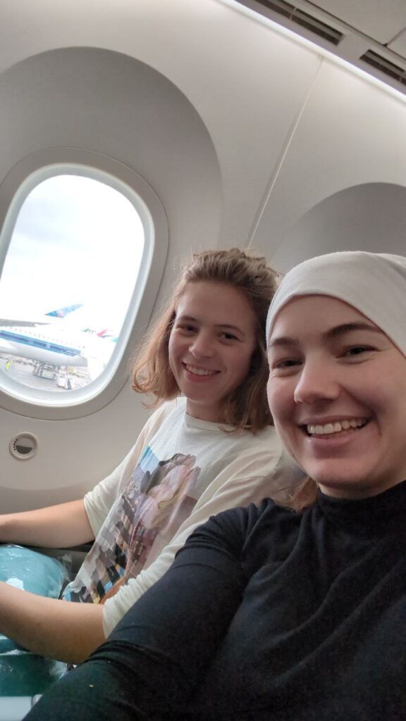 Reisestart im Chaos: Wir mögen die Deutsche Bahn ja wirklich, aber streiken am Tag unseres Abflugs? – Nein, danke. Ein Glück können wir sehr edel auf den VIP-Fahrdienst von Anisas Mama zurückgreifen. Wir erreichen Frankfurt Flughafen also quasi planmäßig. Nach professionellem Herumirren im Flughafen auf dem Weg zur Sicherheitskontrolle, sichern wir uns erstmal den Premium-Fensterplatz im Flugzeug (laut Anisa extra sicher bei Abstürzen, weil wir uns im hinteren Teil des Flugzeugs befinden). Das fehlende vegetarische Essen an Bord wird durch die doch recht umfangreiche Filmauswahl wieder ausgeglichen.