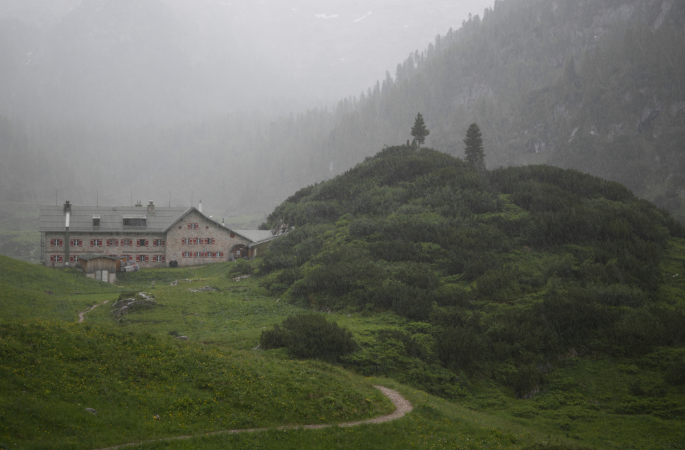 15min vor der Hütte wird es nochmal mies. Der angekündigte Regen kommt plötzlich auf einmal vom Himmel. Etwas triefend erreichen wir dann nach 4h Wanderung das Kärlinger Haus und begeben uns erstmal in den Trockenraum.