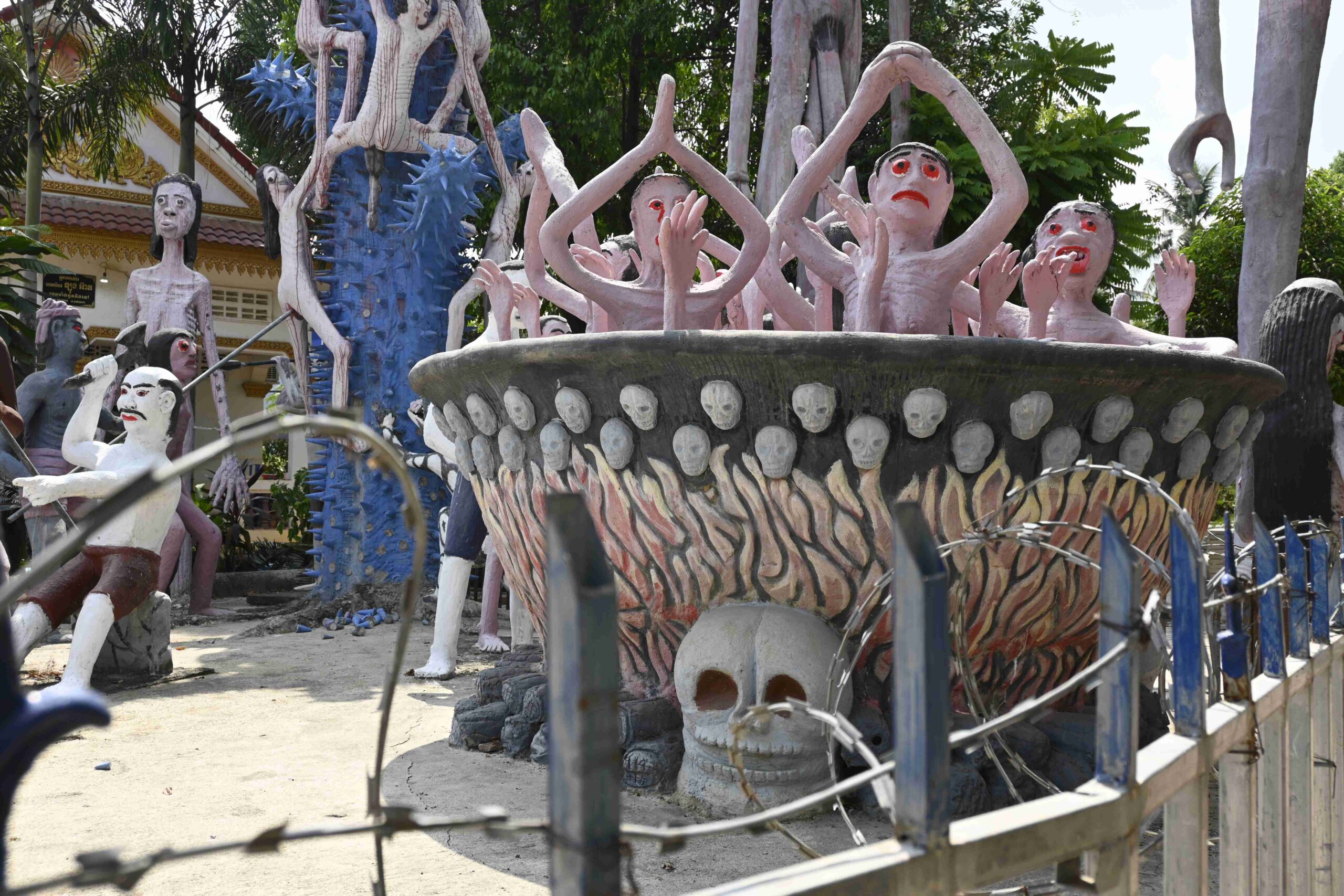 Tuk Tuk: Keine zwei Stunden später erwartet uns Kim der Guide vor unserem Hotel. Neben ihm sein Tuk Tuk. Für drei Personen ist es schon etwas eng, aber egal, immerhin fahren wir das erste Mal Tuk Tuk. Bevor es losgeht werden uns schon die ersten kambodschianischen (Khmer) Wörter beigebracht: Choum Reap Sour (Hallo). Über die staubigen, nur teilweise asphaltierten Straßen geht es ins städische Umland. Auf dem Weg hält Kim immer wieder an, um uns Geschichten zu den Statuen auf den Verkehrkreiseln zu erklären, ein Stück Zitronengras zu pflücken, kleine Tempel zu bestauen und uns das Prinzip von Karma an sehr eindrucksvoll verstörenden Figuren zu zeigen.