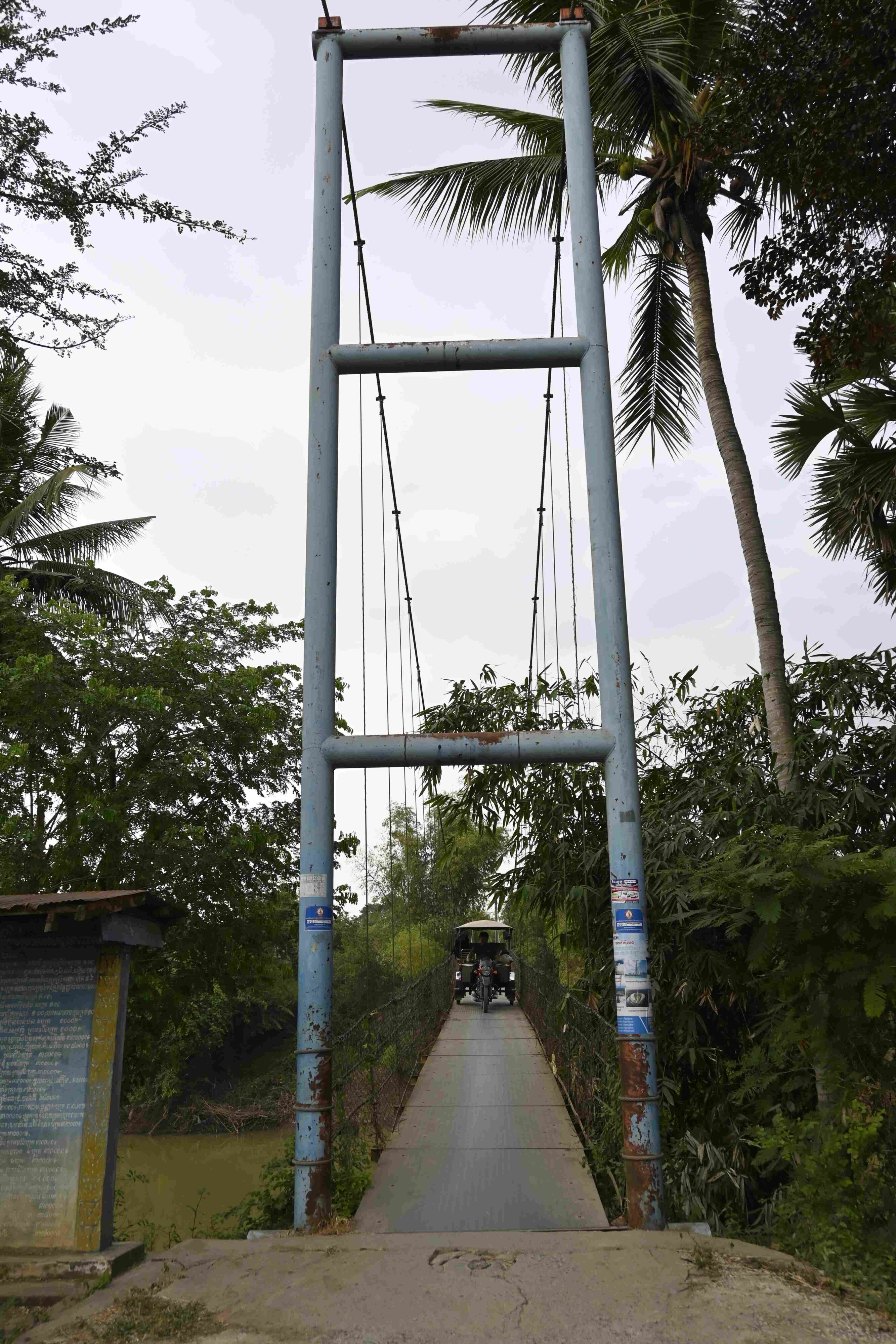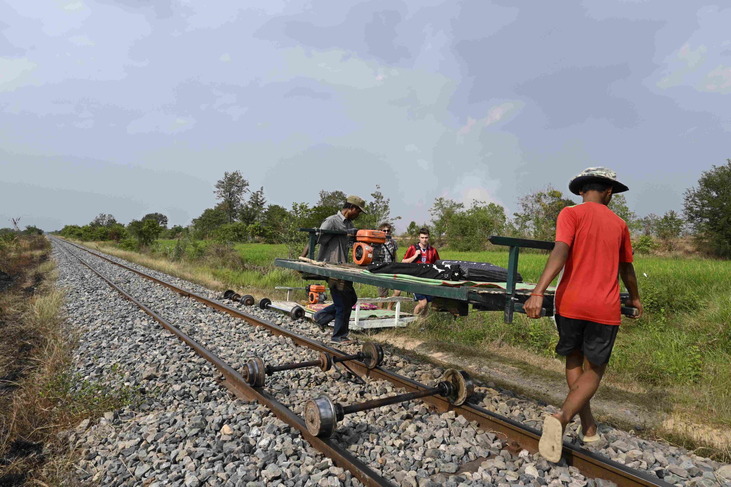In der brütenden Mittagshitze geht es weiter. Mittlerweile bleibt der Staub von den Straßen (liebevoll „cambodia snow“ genannt) an unserer, vom Schweiß, feuchten Haut richtig schön kleben. Zum Glück können wir bei der Fahrt mit dem Bambuszug etwas trocknen.