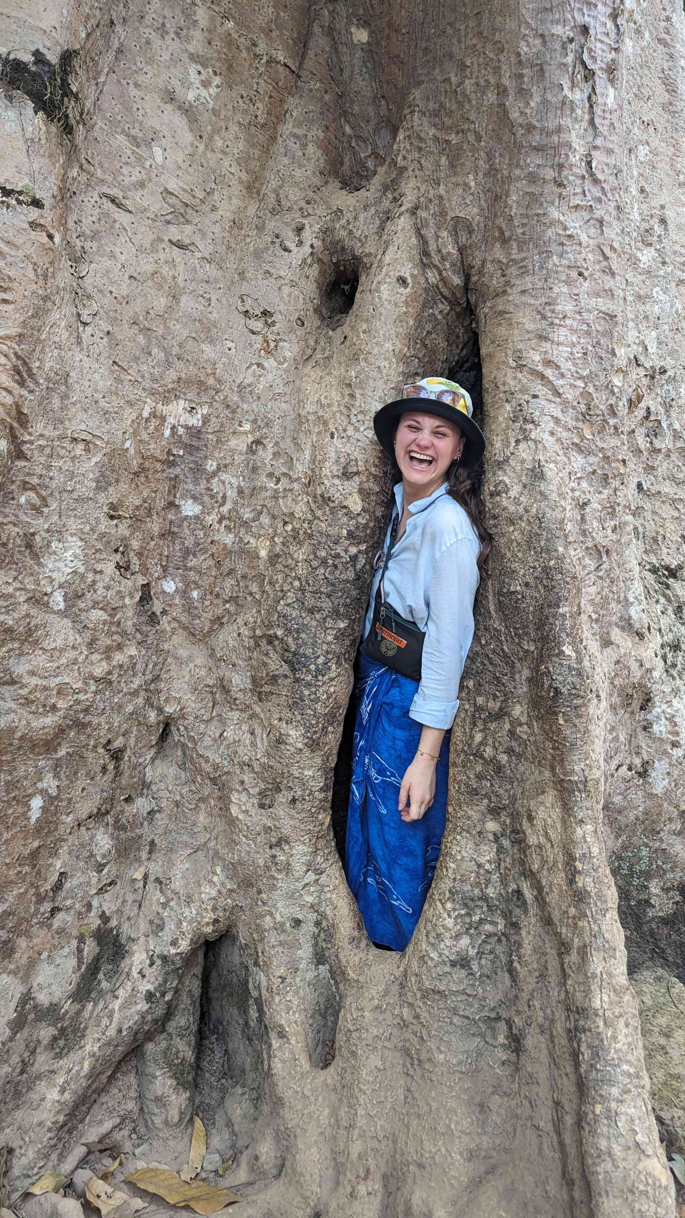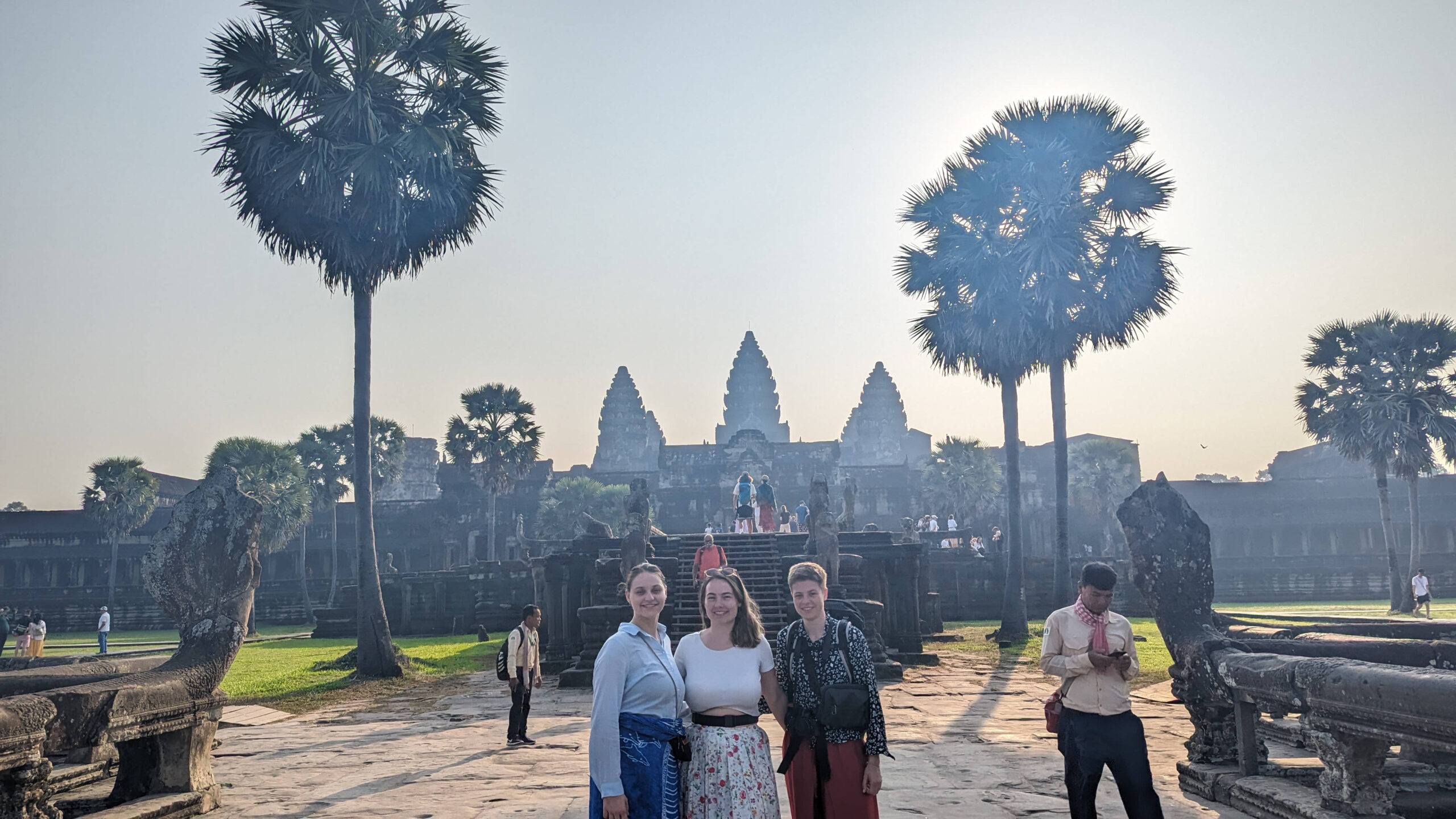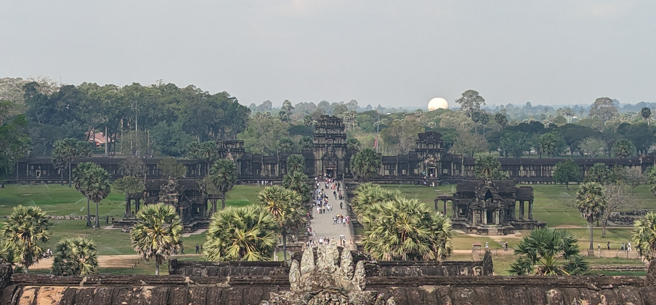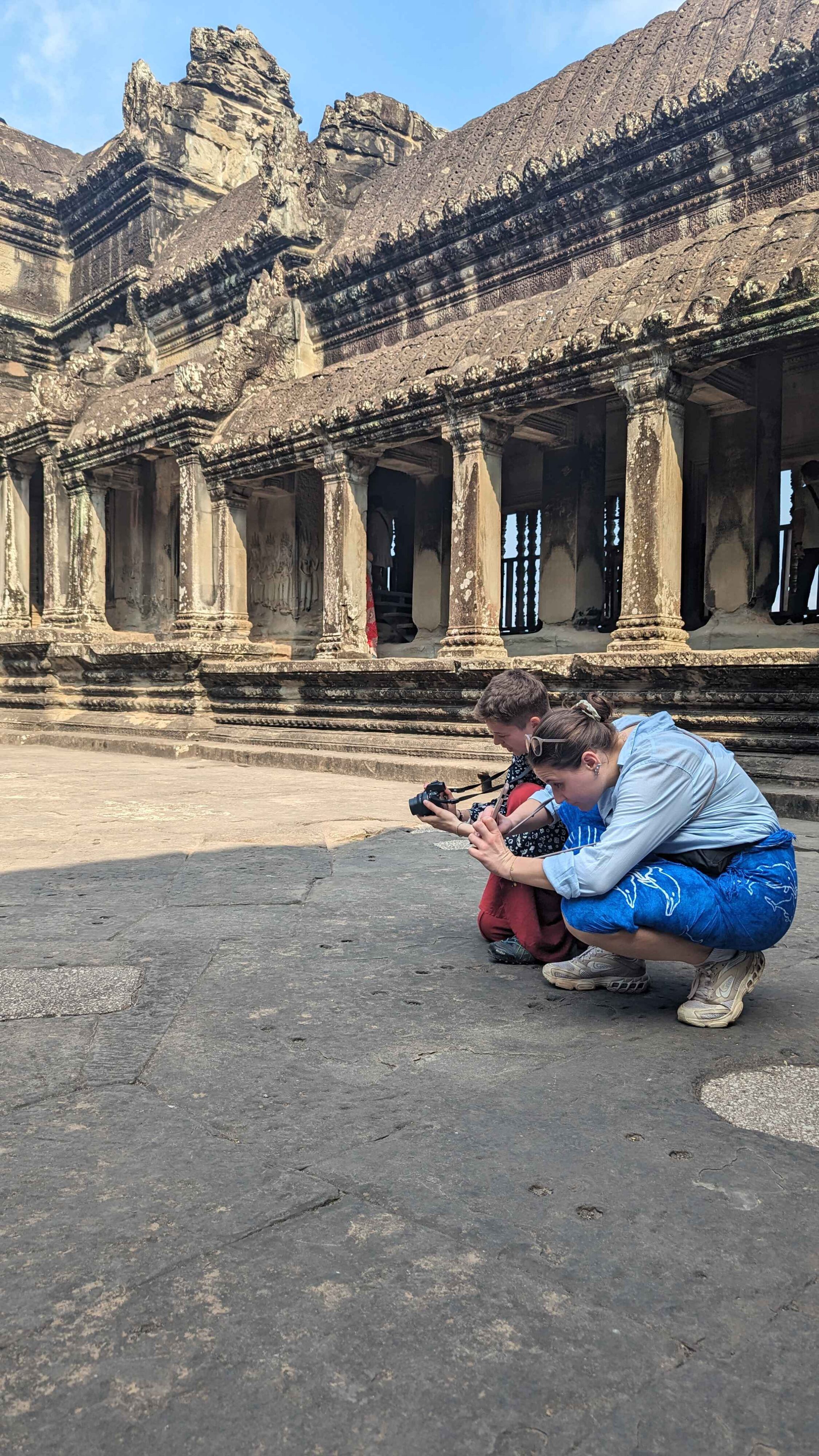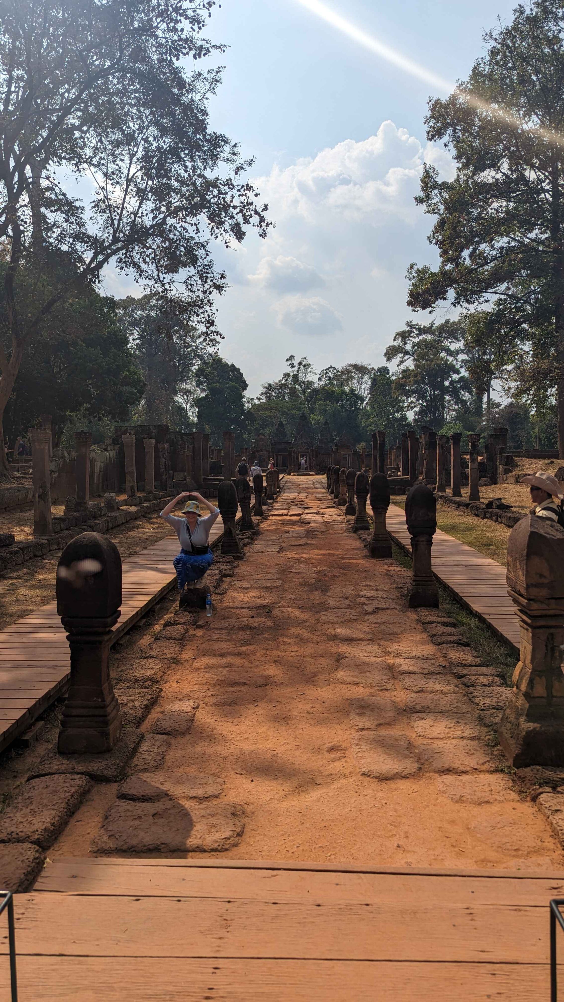 Nach einem schnellen Frühstück, dass das Hostel glücklicherweise To-Go anbietet, treffen wir um 7 Uhr auf unseren Privat-Guide für heute (klingt sehr edel und kostet deswegen natürlich auch). Aber wir sind sehr froh ihn zu haben. Mit seinen Cowboyhut finden wir in auch in der Menge wieder und löchern ihn mit Fragen während er uns durch den Hauptteil der riesigen Tempelanlage führt. Er zeigt uns die einzige, in Stein gehauene Frau, die beim Lächeln ihre Zähne zeigt und führt uns zu einem Torbogen mit tollen Sound wenn man sich auf den Brustkorb klofft. Bleibt mit uns am Mittelpunkt des Tempels stehen, erklärt uns die Bedeutung hinter den Szenen der Wandreliefe und macht uns auf die steinernden Wächter des Tempels aufmerksam.