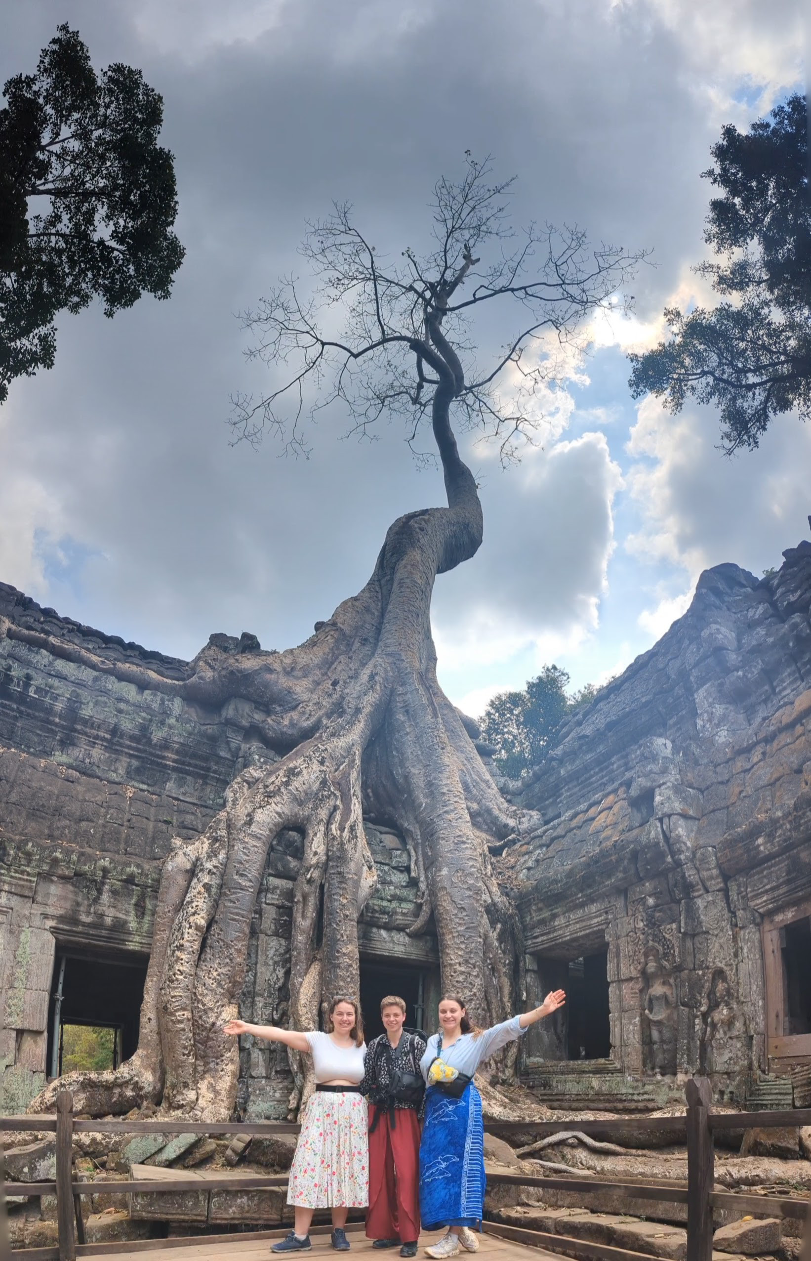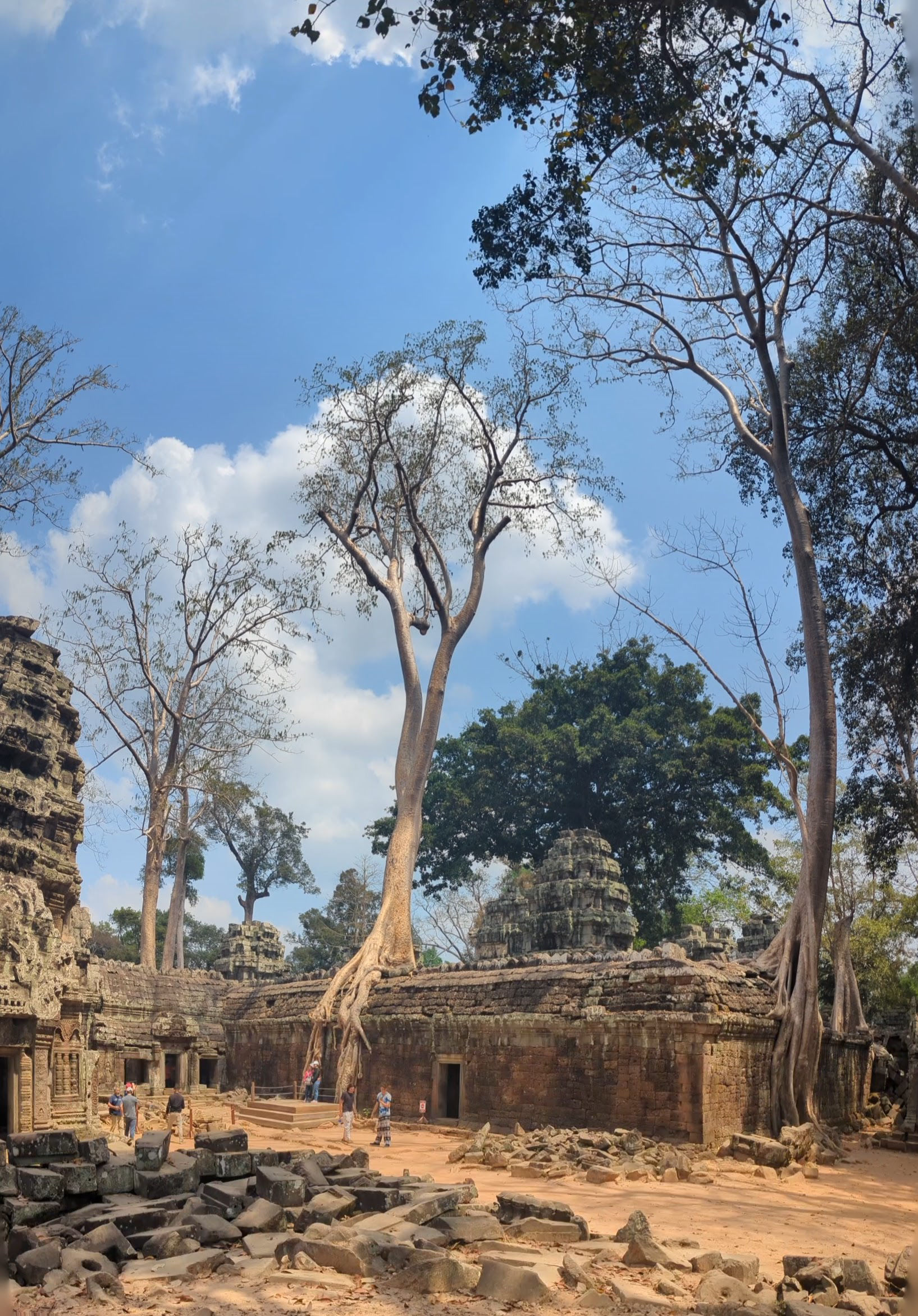 Nach der Haupttempelanlage lassen wir uns mit dem Guide von unserem Tuk-Tuk Fahrer zum sehr beliebten Lara Croft Tempel bringen. Hier wurden Teile des Tomb Raider Films gedreht. Es erwartet uns ein Tempel, der in Symbiose mit der Natur zu leben scheint. Ganz so idyllisch ist es aber nicht: Dieser Tempel wurde sehr schnell errichtet, weil der damalige König ungeduldig war und schnell Ergebnisse sehen wollte. Der Zeitmangel in der Planung des Tempels führte zu einer schlechten Konstruktion mit minderwerten Materialien. Dies und die mangelnde Führsorge über Jahrzehnte spiegelt sich im heutigen Bild des Tempels wieder, auch wenn schon viel restauriert wurde.
