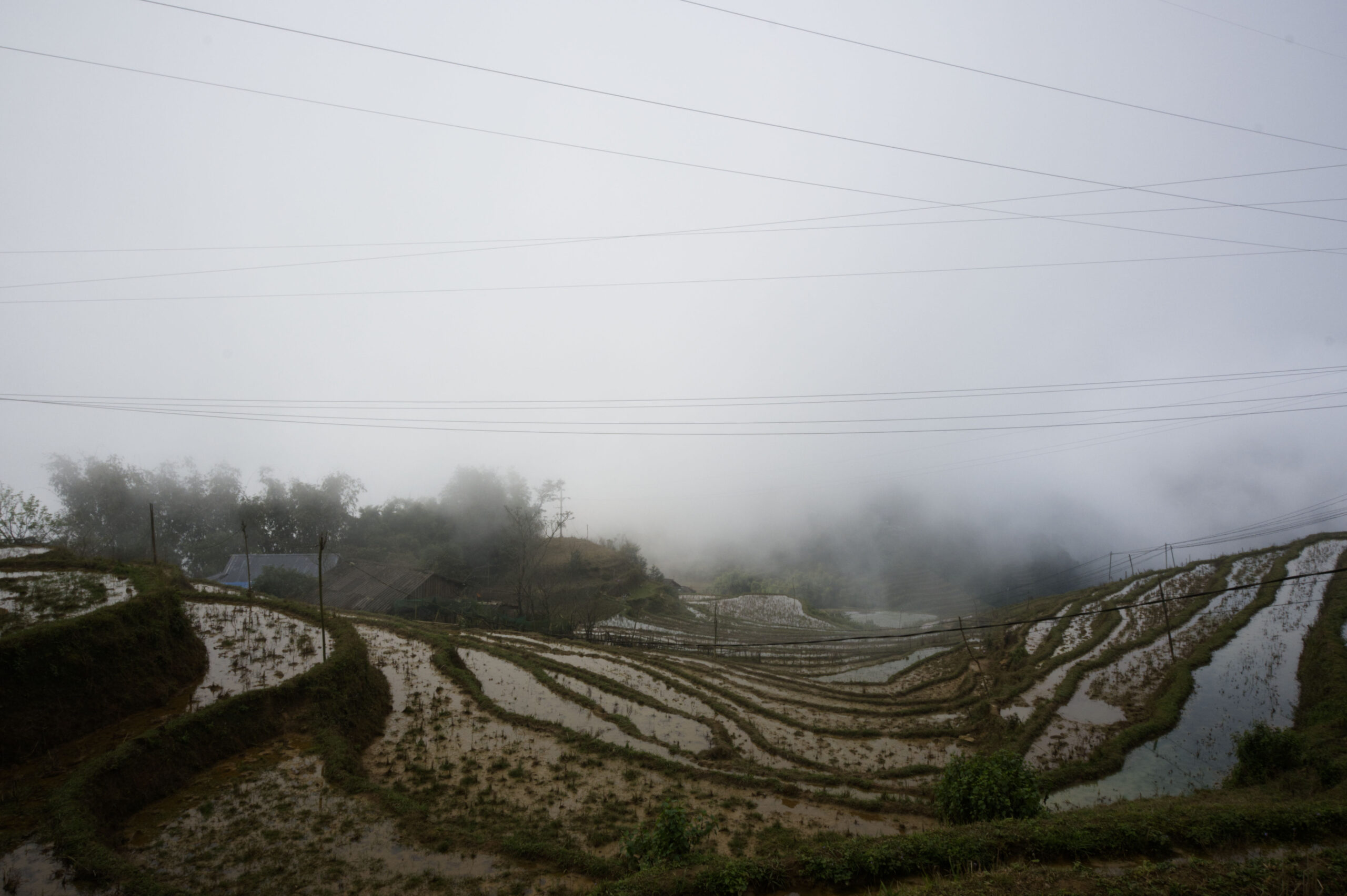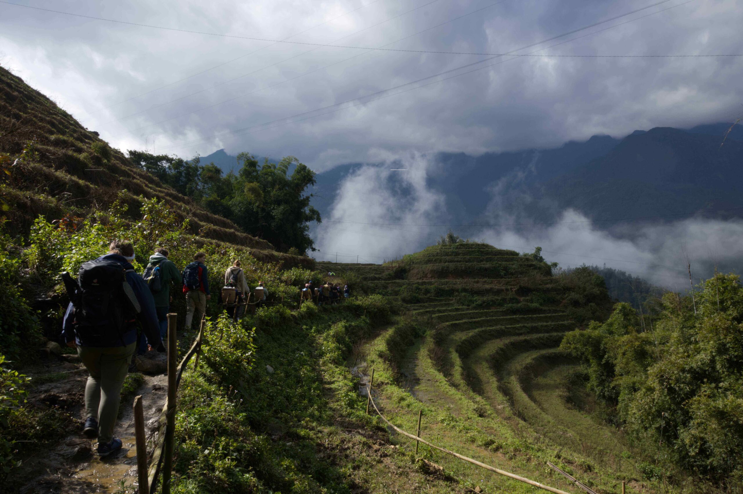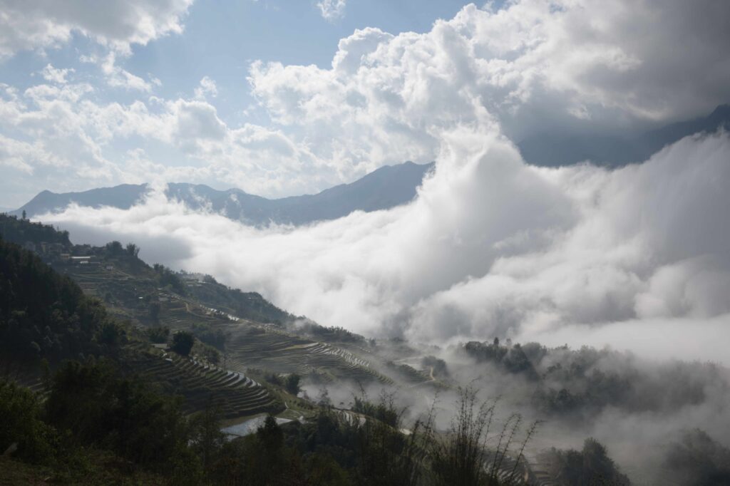 Die Reisberge: Dann geht es endlich los! Die geometrisch perfekt terassierten Reisberge liegen vor uns. Immer wieder taucht ein neuer Einblick in die Berglandschaft aus den Nebelschwaden auf.
