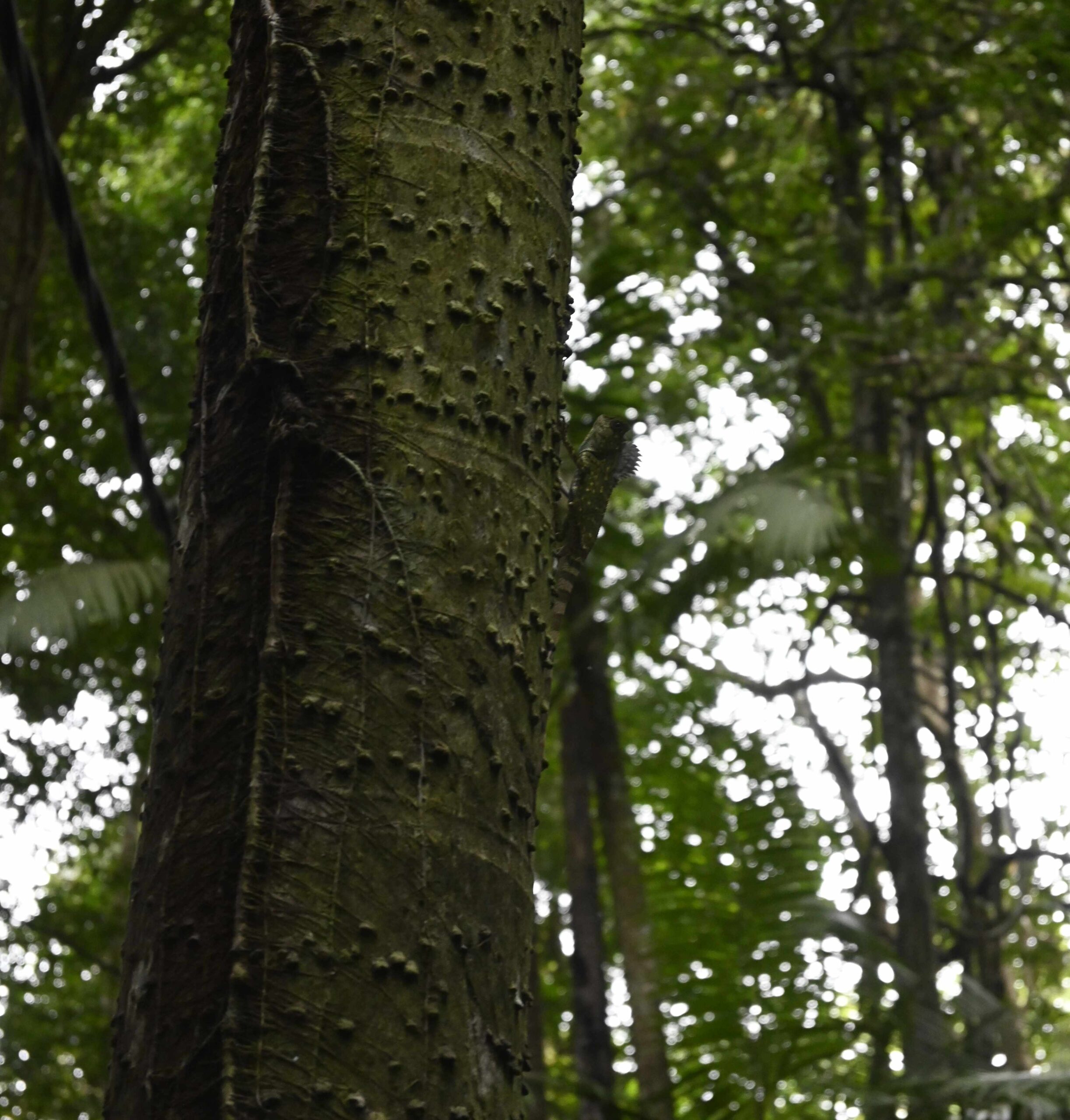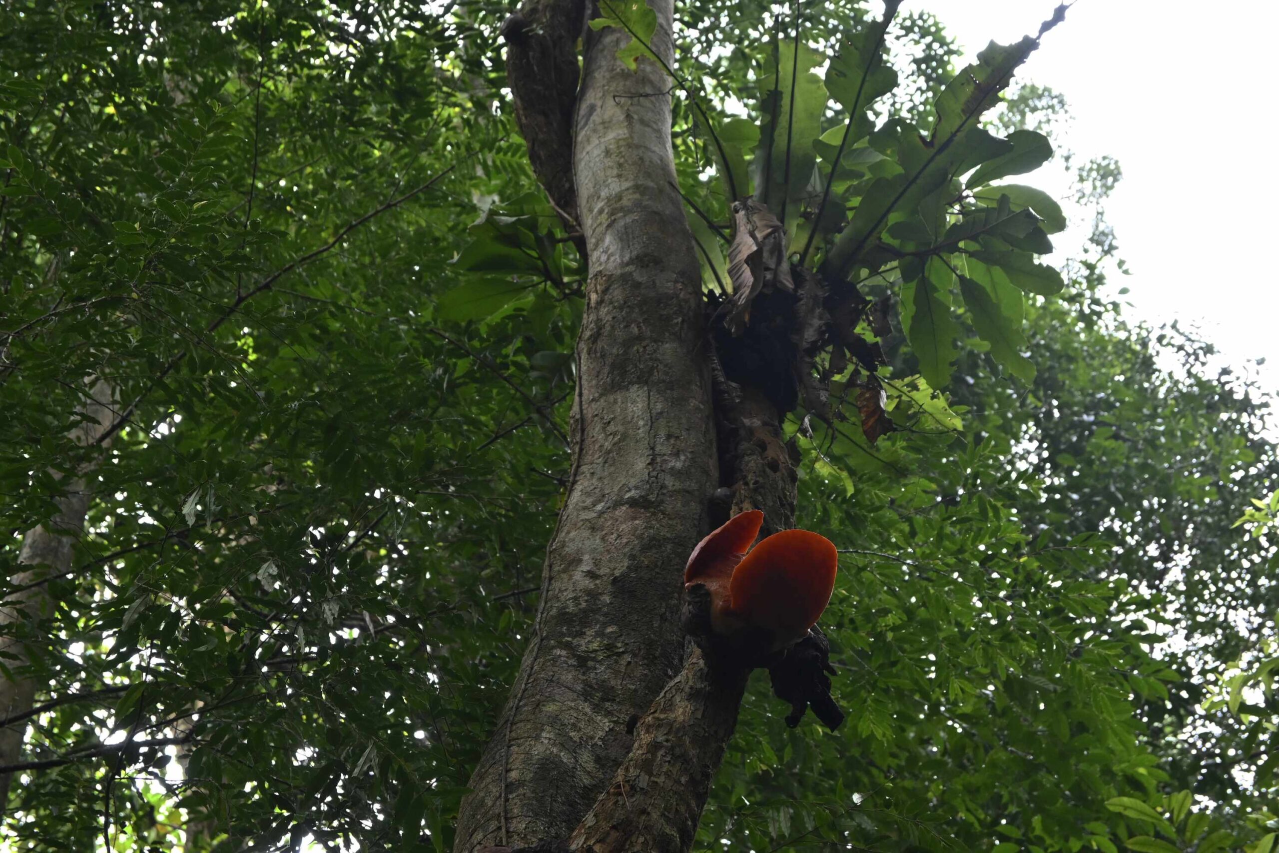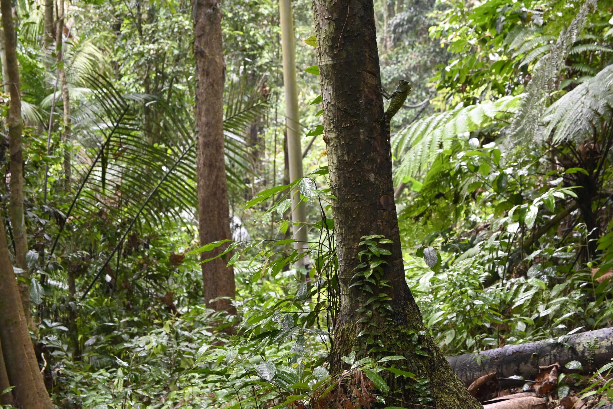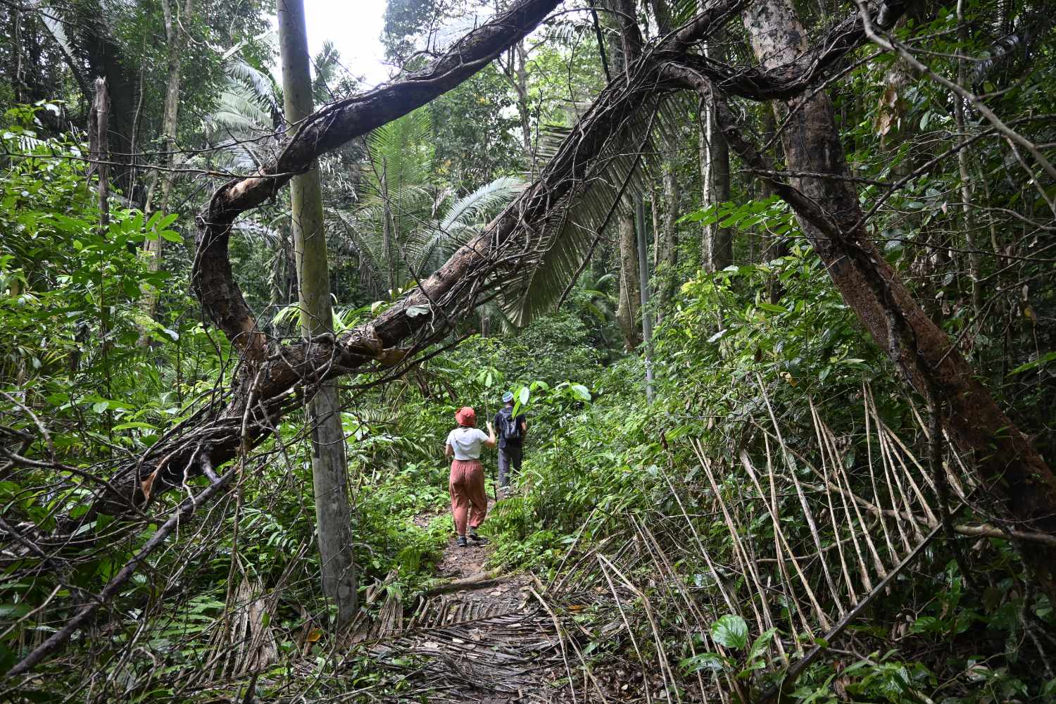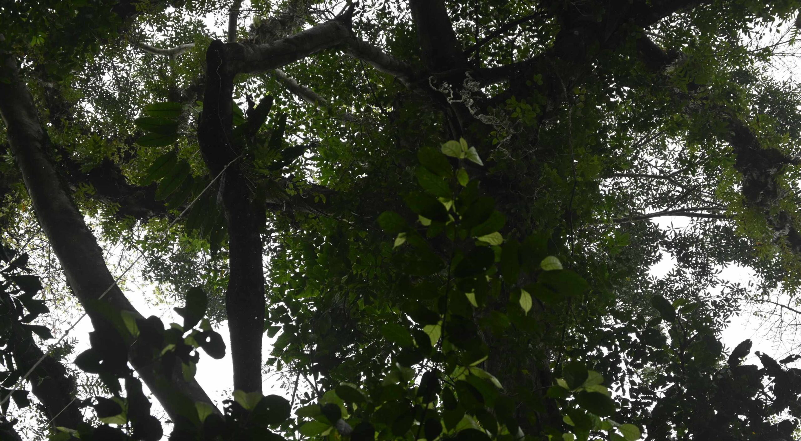 Während unserer Tour fängt es an zu regnen. Die Bäume sind hier so hoch, dass wir den Wassertropfen, die es durch das Blätterdach schaffen, beim Fallen zusehen können.