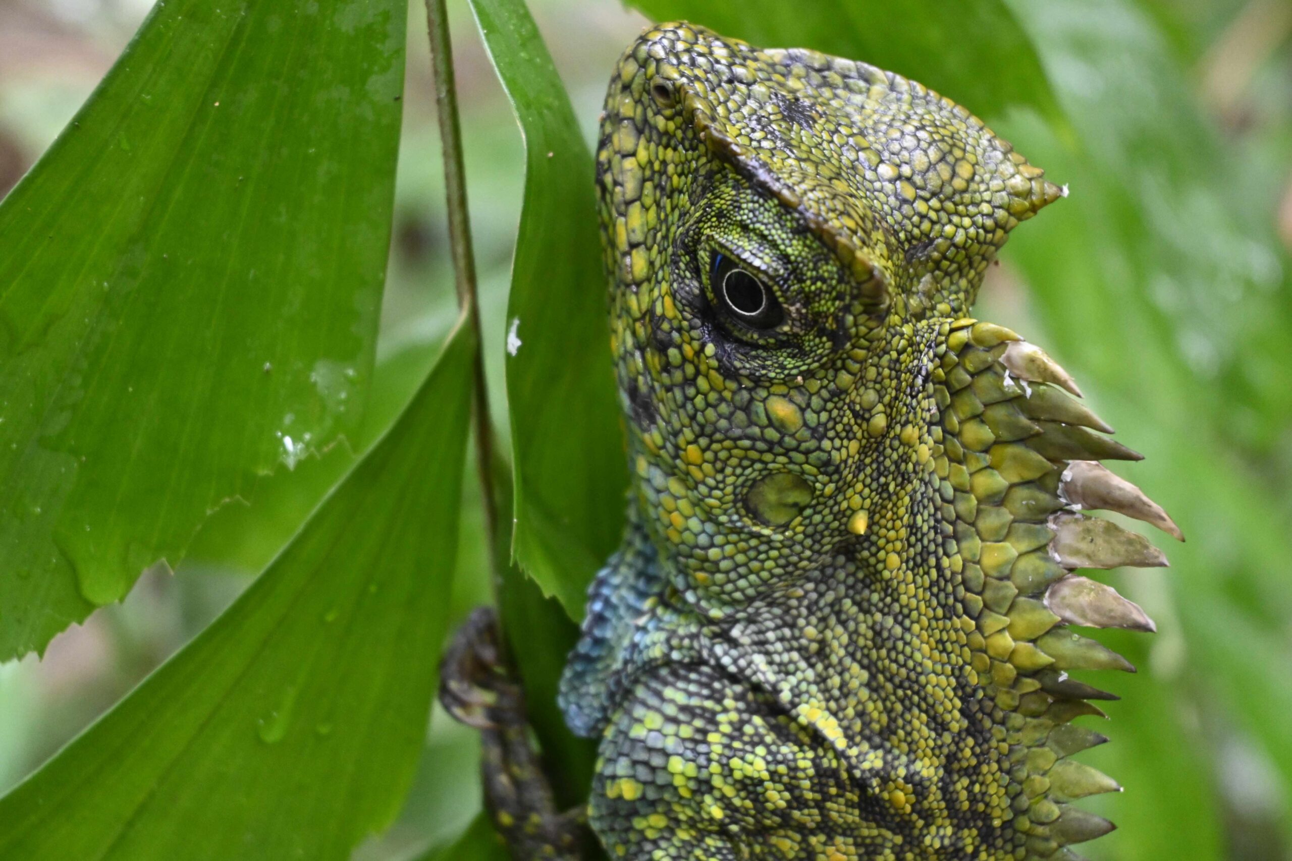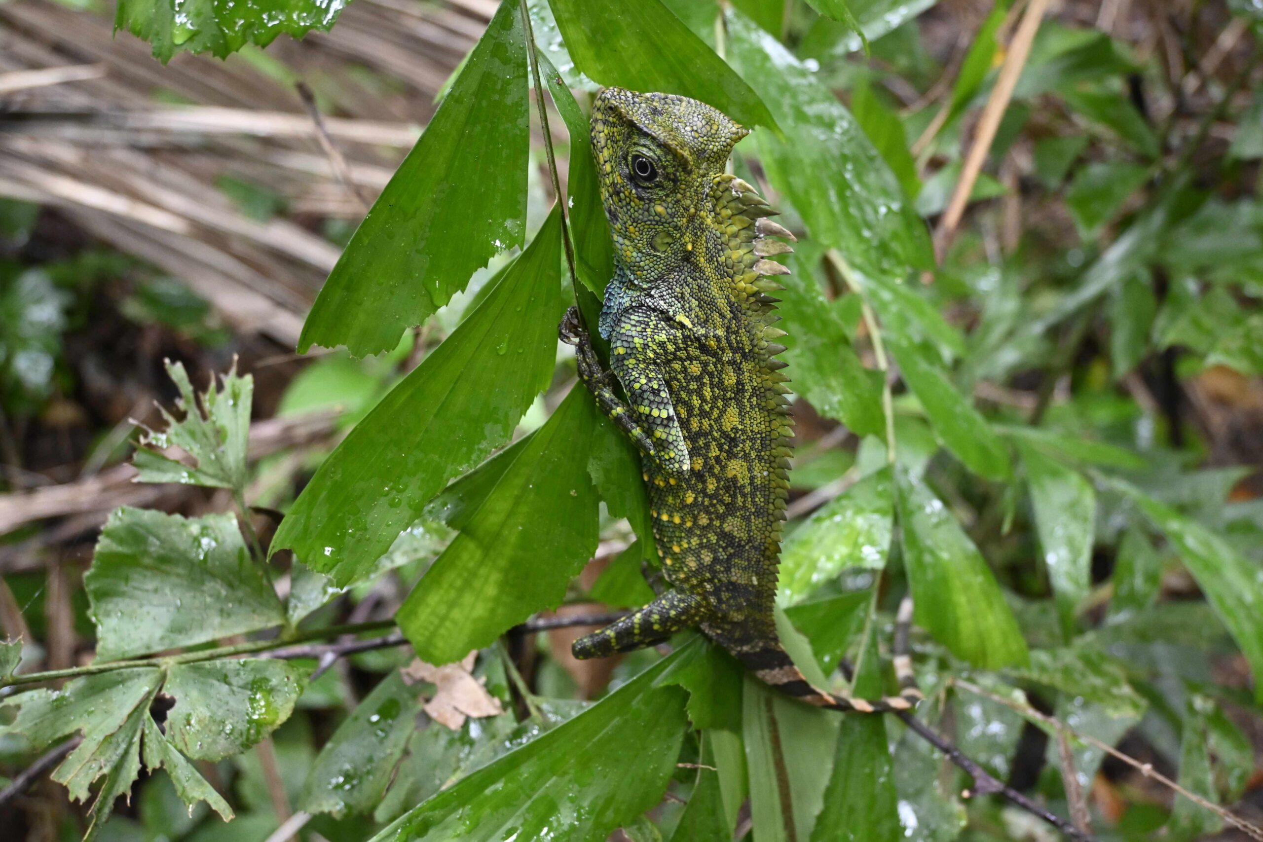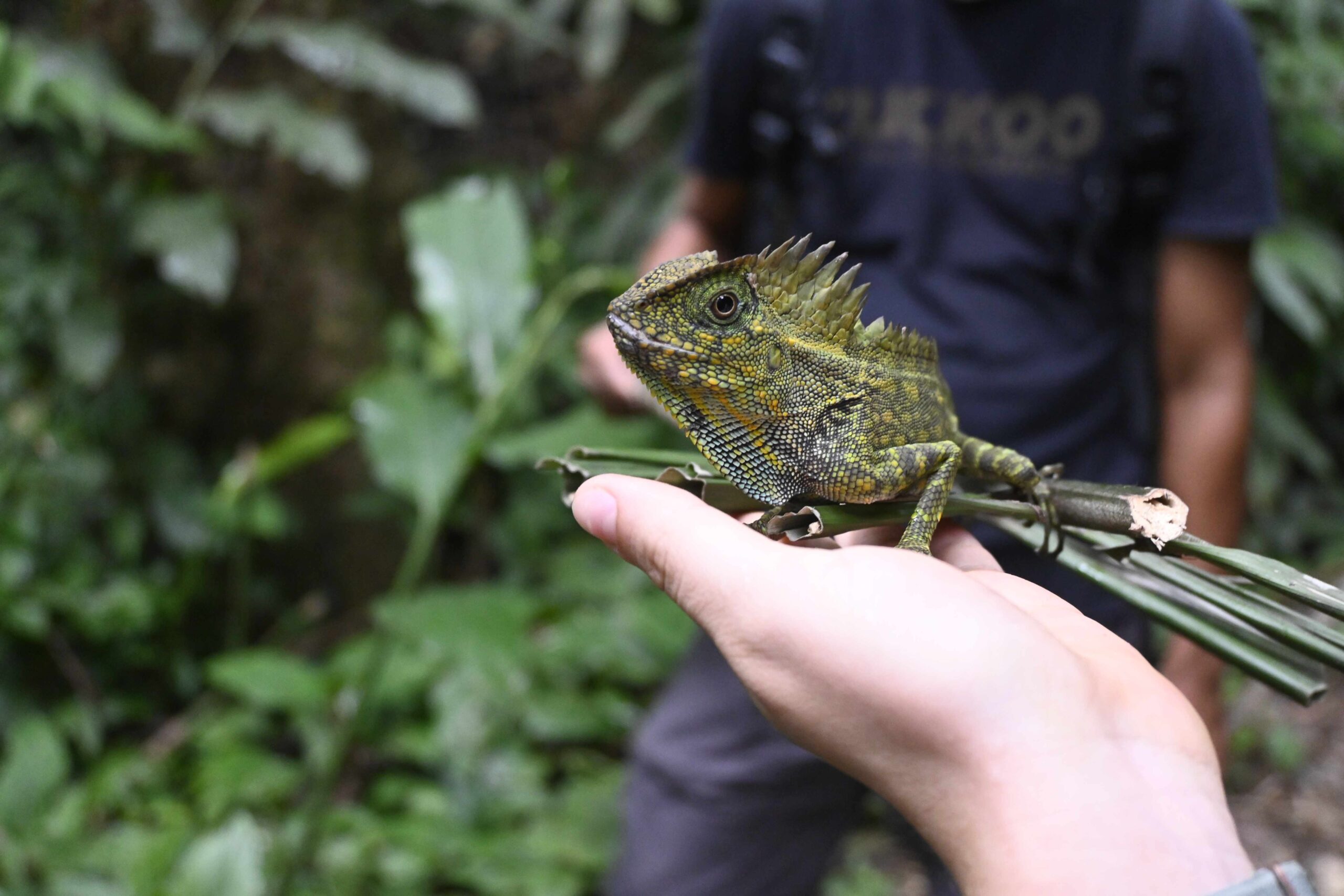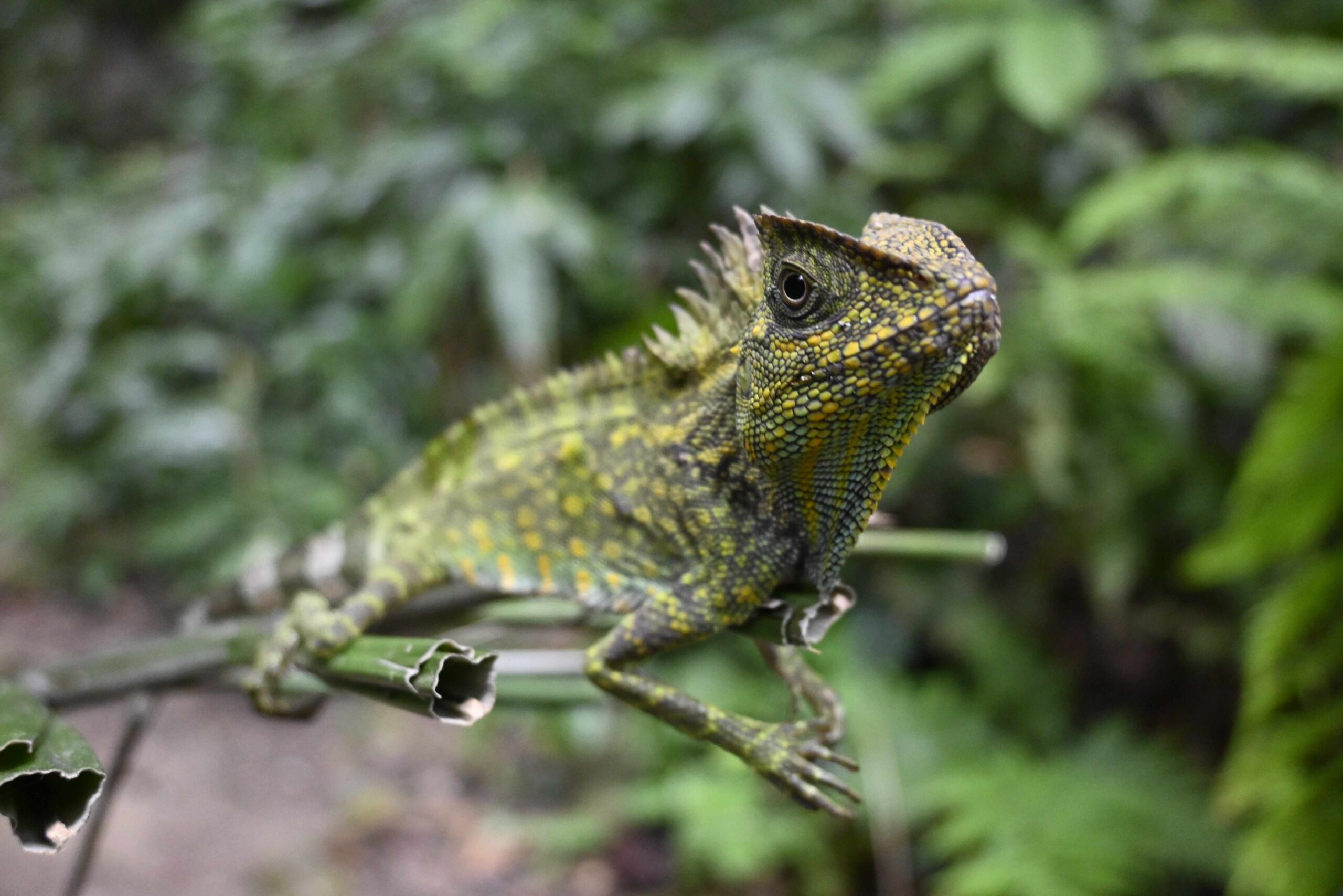 Zum Glück haben wir einen aufmerksamen Guide. Geschickt fischt er das kleine Chamäleon mit Hilfe von zwei Palmblättern vom Baum, so dass wir es aus nächster Nähe bestaunen können.
