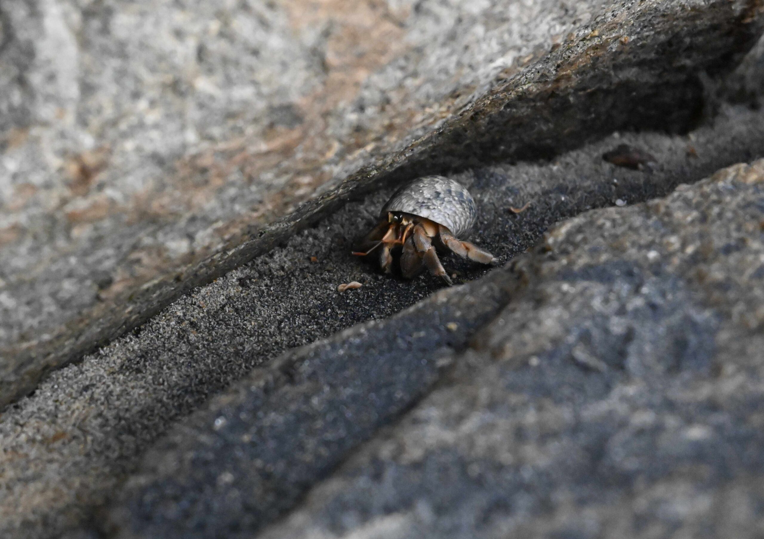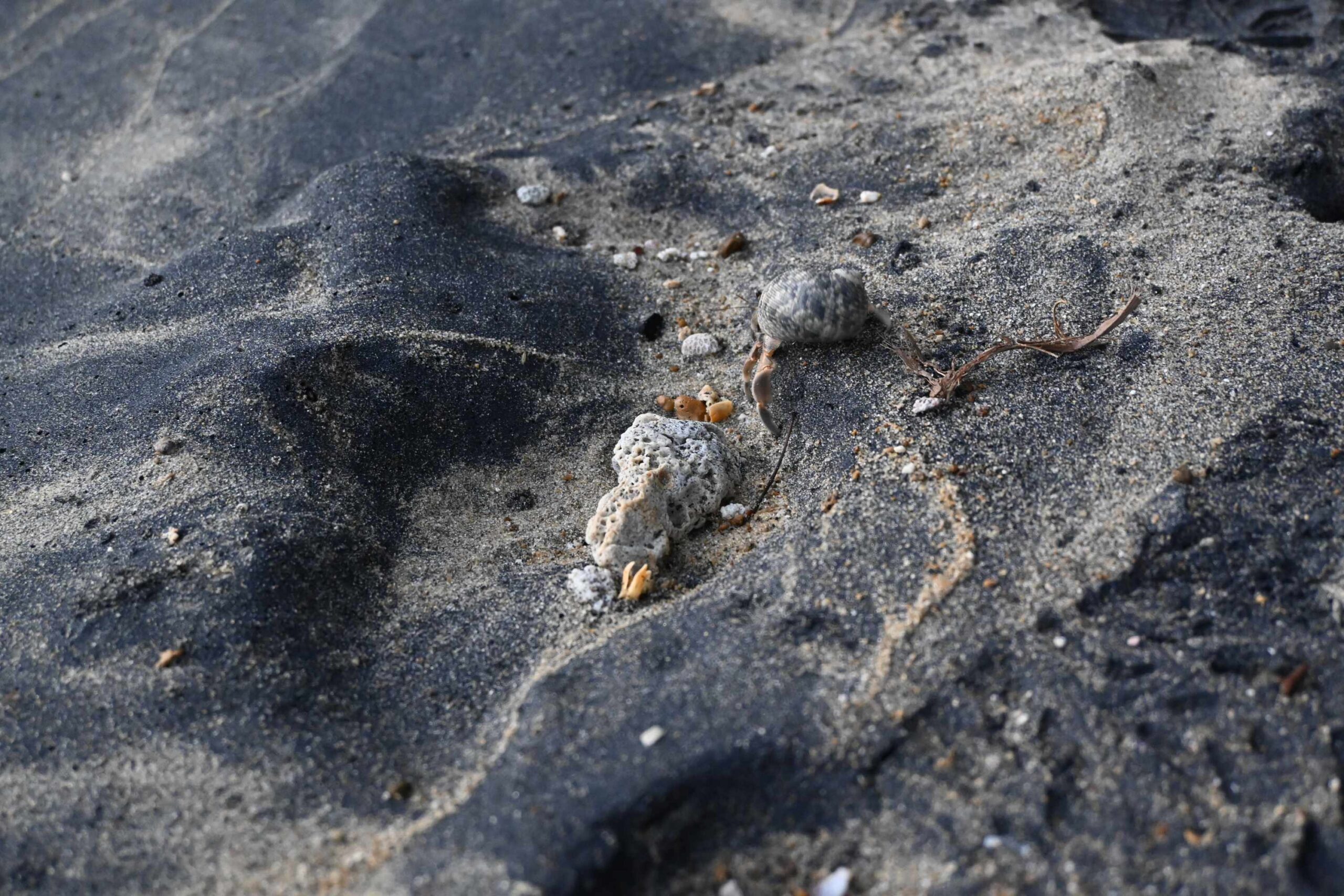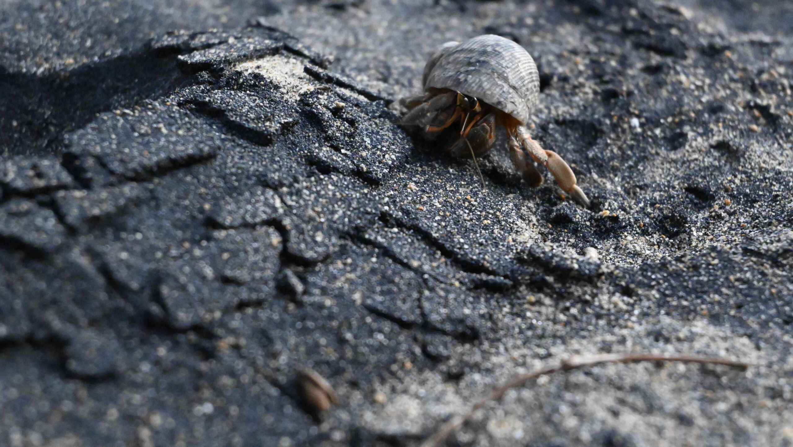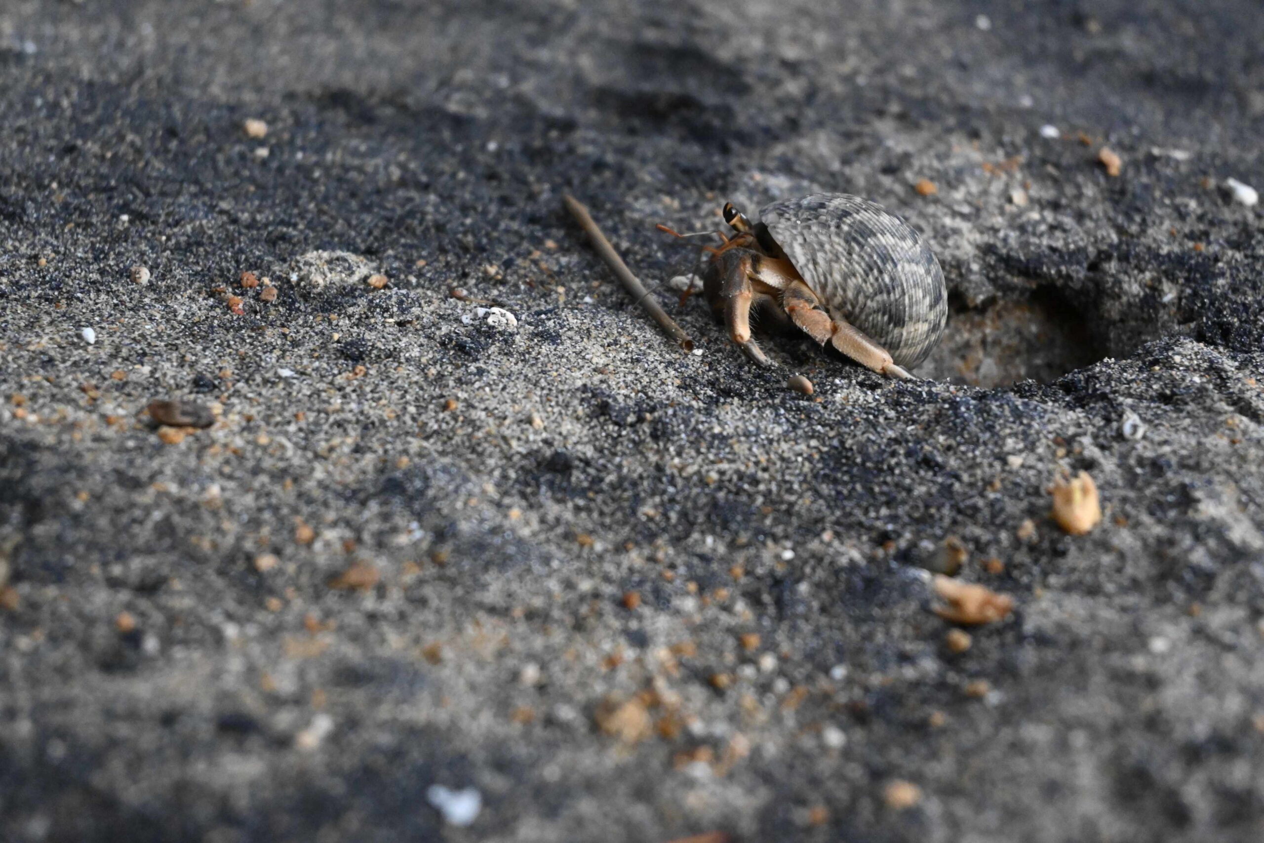 Abends am Strand erwartet uns noch eine weitere wundervolle Entdeckung. Über den schwarz-mellierten Sand krabbelt ein Einsiedlerkrebs, der sich mit der Wahl seiner Muschel perfekt an die Umgebung angepasst hat.