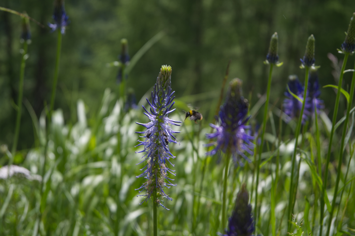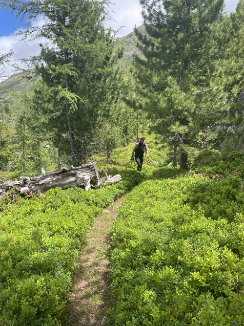 Nach einer Weile entlang von Bergwiesen kommen wir an die Abzweigung an der wir uns zwischen den im Wanderführer empfohlenen Weg und dem von einem Wanderer auf dem Glocknerhaus empfohlenen Panoramaweg entscheiden müssen. Wir vertrauen dem Wanderer und beginnen den Aufstieg zum steilen Berghang an dem der Panoramaweg verlaufen soll. Die fehlende Zeitangabe auf dem ersten Schild zum Panoramaweg wird nach einigen Kilometern und vor allem vielen Höhenmetern nachgeholt: 4,5h noch zur Elberfelder Hütte. Ob wir uns da nicht zeitlich etwas verschätzt haben? Eigentlich sind wir von einer deutlich kürzeren Wegstrecke ausgegangen. Aber schon bald denken wir darüber nicht mehr nach, weil uns der Weg durch wunderschöne Landschaft führt: blühende Berghänge, eine einfach tolle Aussicht während wir immer wieder das Pfeifen von Murmeltieren hören.