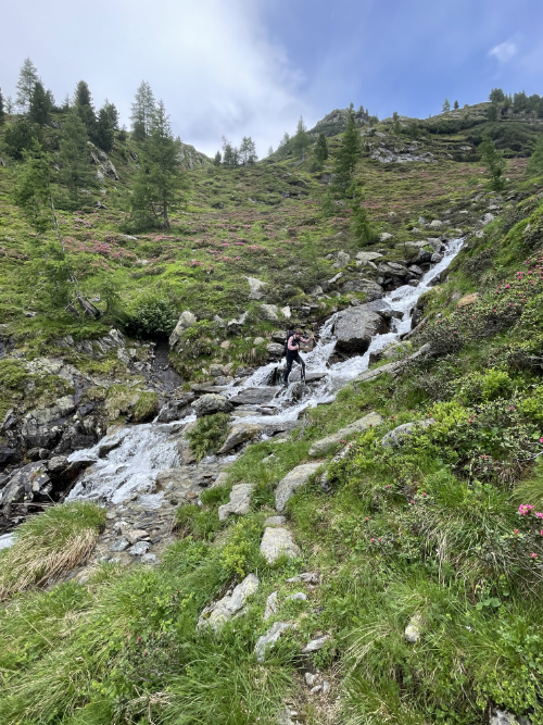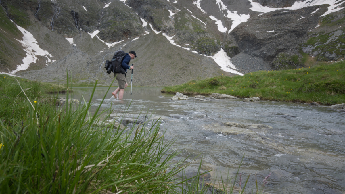 Und plötzlich stehen wir vor einem reißenden Bach ohne Brücke oder sonstige Überquerungshilfe. Uns ist etwas mulmig zu Mute als wir uns unseren Weg mit den Stöcken durch das rauschende Wasser suchen. Wenig später stehen wir vor dem nächsten breiten Bach, der zwar weniger reißend ist, aber dafür keine Steine für einen trockenen Überweg bietet. Da bleibt nur eins: Schuhe aus und die Kälte aushalten. Spätestens hier wird uns bewusst das dieser Weg bei so viel tauendem Restschnee in den Bergen nicht unbedingt die beste Wahl ist.