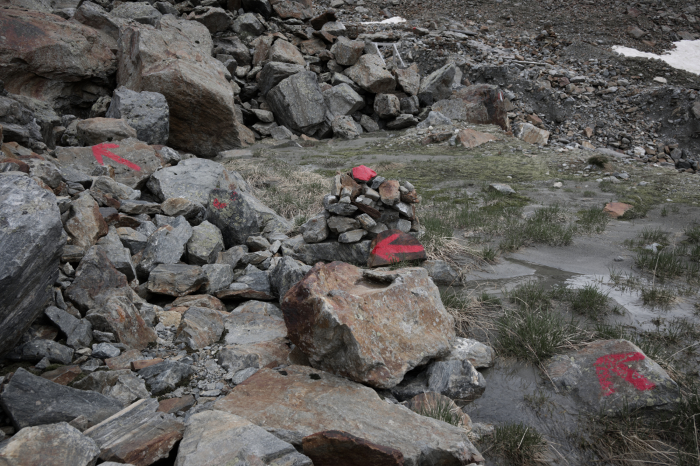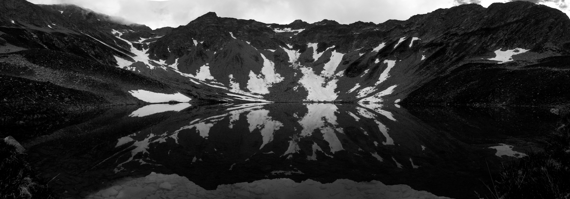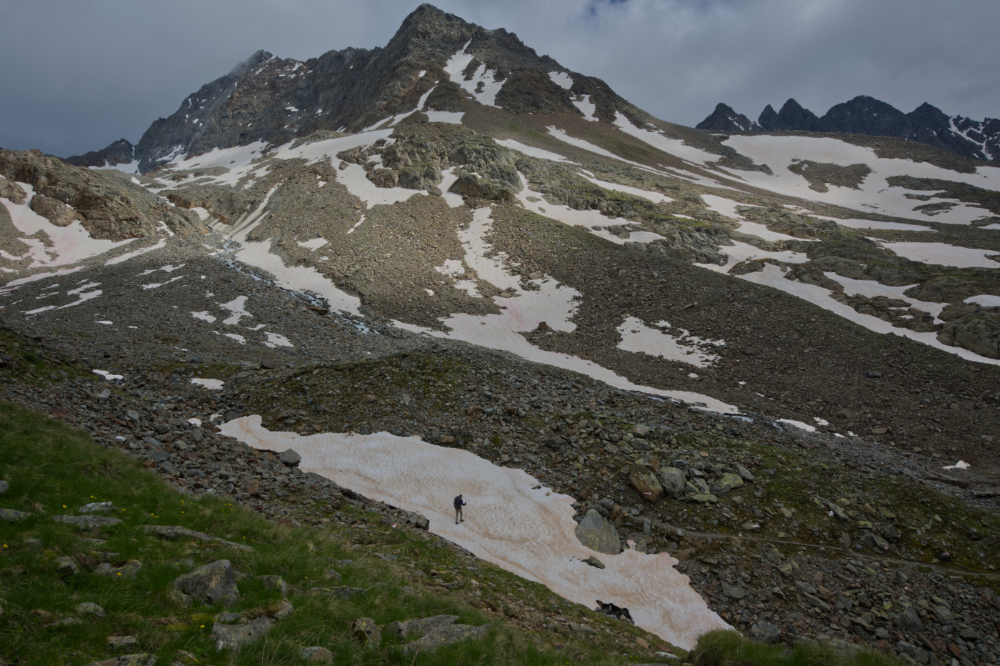 Wir begegnen auch auf dem weiteren Weg keiner Menschenseele, nur ruhig daliegenden Bergseen mit Überresten von Eisschollen, großen und steilen Schneefelder, die wir auf den Geröllabhang umgehen müssen sowie einer Herde Schafe.