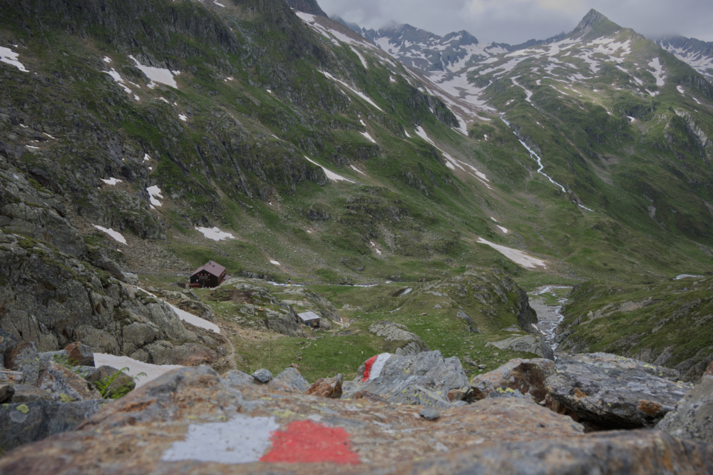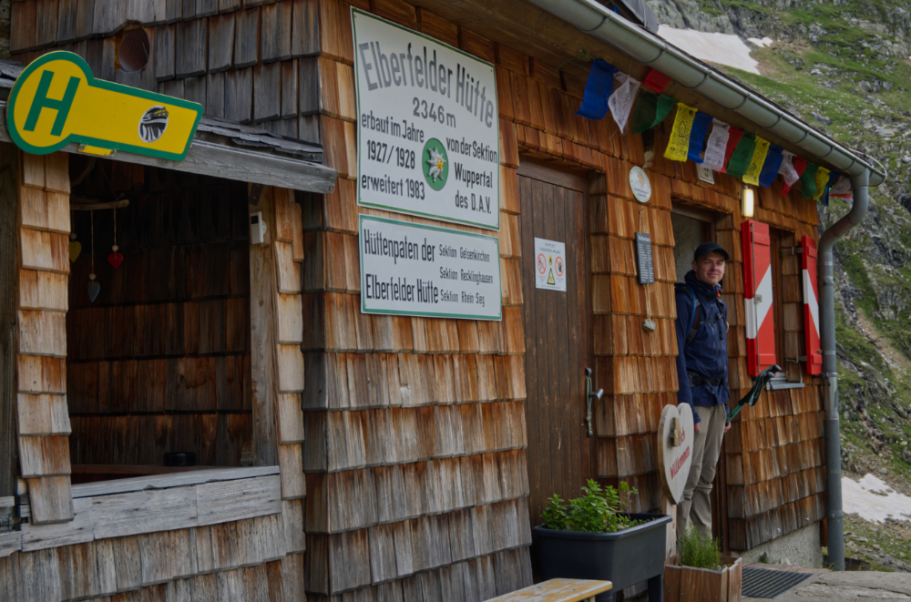 Über ein paar flachere und kleinere Schneefelder bahnen wir uns schließlich den Weg zur Elberfelder Hütte. Fast verwunschen liegt sie in dem einsamen Tal.