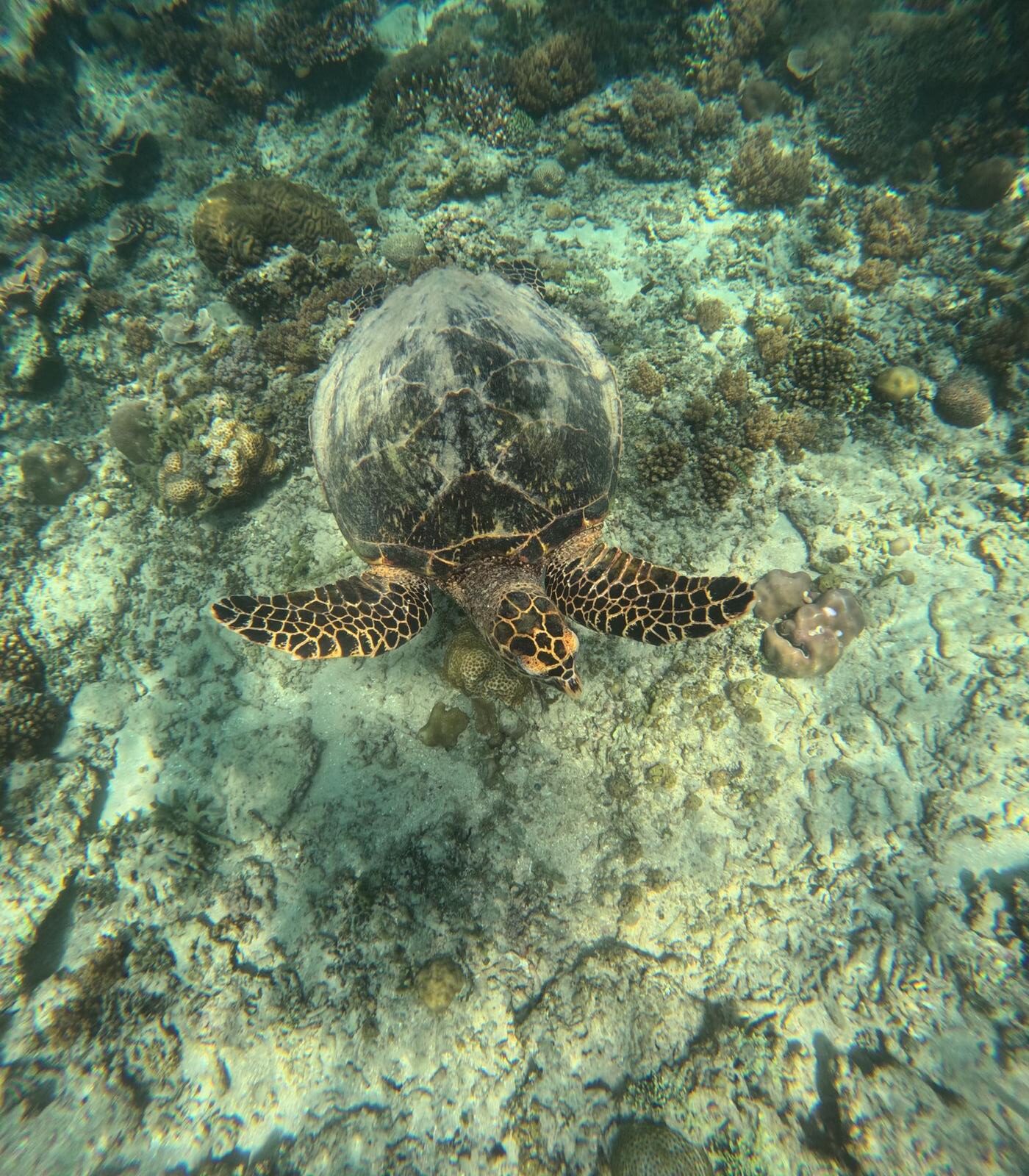 Eigentlich eine schöne Idee, nur nicht ganz so schön umsetzbar, wenn es so voll ist, dass man hin und wieder eine Flosse von anderen Schwimmern ins Gesicht bekommt. Außerdem ist die Meeresströmung so stark, dass man die Korallen nicht in Ruhe anschauen kann, weil man dann schon weitergetrieben ist. Immerhin wartet das Boot dann immer stromabwärts, um uns wieder einzusammeln. Der zweite Schnorchelspot verspricht Meeres-Schildkröten. Und tatsächlich: ein wirklich großes Exemplar taucht am Rande des Korallenriffs aus dem tiefblauen Wasser auf. Ich fühle mich wie in Findet Nemo.