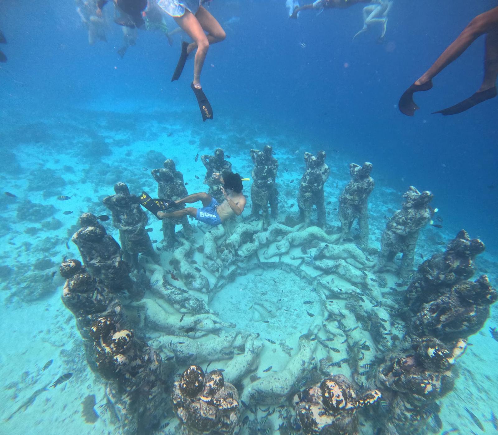 Flossen anprobieren, Taucherbrille einpacken und den Anderen hinterher aufs Boot. Auch hier erwacht der Motor laut knattern zum Leben, bevor es los geht Richtung Gili Meno. Die kleinste der drei Inseln ist von einigen interessanten Schnorchelspots umgeben. Am ersten Spot haben wir die Gelegenheit Unterwasserstatuen zu bestauen.