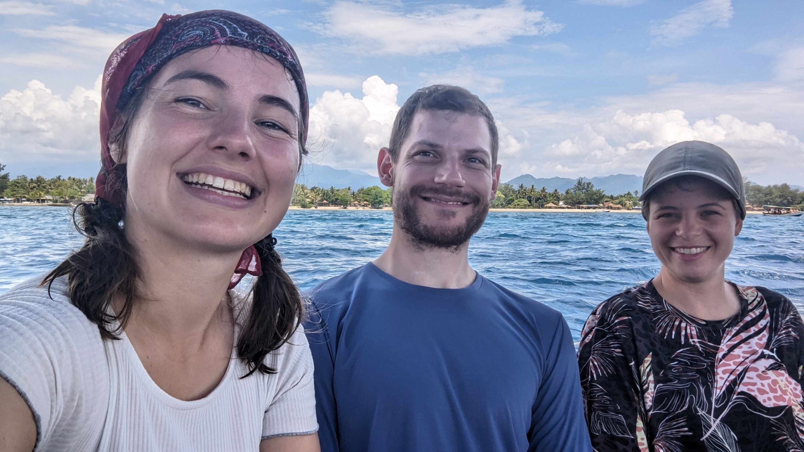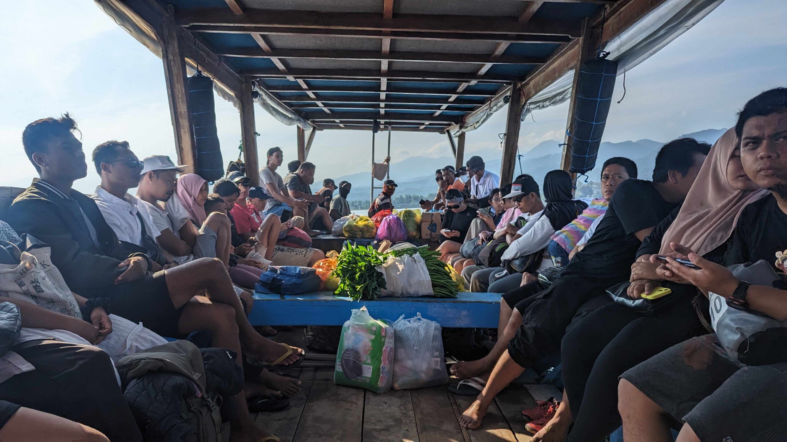 Wir legen ein wirklich gutes Timing an den Tag und können keine 2min nach Fahrkartenkauf durch das Wasser waten und das Boat betreten. Ein kurzer Blick genügt, um zu wissen, dass wir die einziges weißen Menschen an Board sind. Von lautem Motorgeratter begleitet schaukeln wir hinüber nach Gili Trawangan.