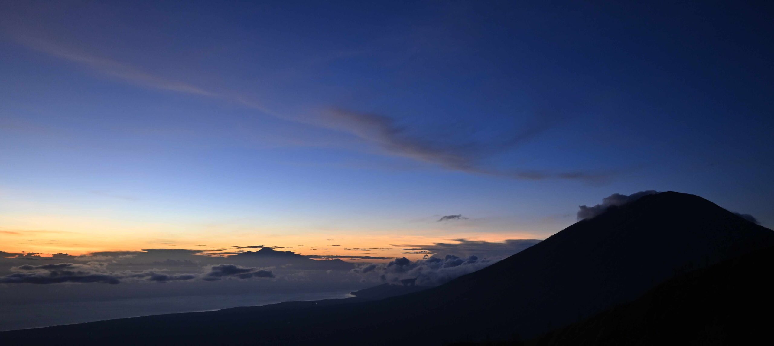 02:00 Uhr – Der Weg nach oben: Wir sind da – irgendwo mitten in den Vulkanberge im Nordosten Balis. Nach kurzer Klopause und Schuhe festschnüren geht es los. Da es wirklich stockfinster ist, sind wir sehr froh über unsere Stirnlampen. Wie an allen Vulkanbergen geht es ziemlich driekt sehr steil nach oben. Das Gute beim im Dunkeln wandern ist, dass man nicht sieht was noch vor einem liegt, sondern nur einen Fuß vor den anderen setzt. Unsere erste Pause findet an einem kleinen einheimischen Stand stand, der auf einer Ebene ziemlich aus dem Nicht auftaucht. Mit Tee und Kaffee stärken wir uns hier etwas bevor der Aufstieg weiter geht. Im Schein unserer Stirnlampe sehen wir weiterhin nur den Weg aus schwarzer Vulkanasche. Links und rechts säumen noch taunasse hohe Pflanzen den Weg. Nach einer weiteren kleinen Ewigkeit durchs Dunkel laufen, begegnen wir den ersten Zelten die am Wegrand aufgeschlagen wurden. Wie gerne würden wir, eingekuschelt in Schlafsäcke, dort drin schlummern.